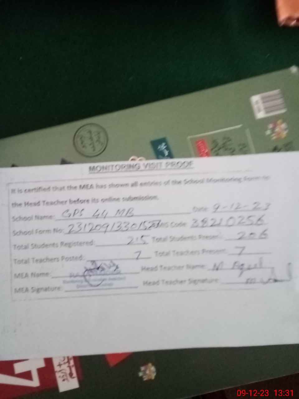 | Attendance Register | Head Teacher | MEA with School | Visit Proof |