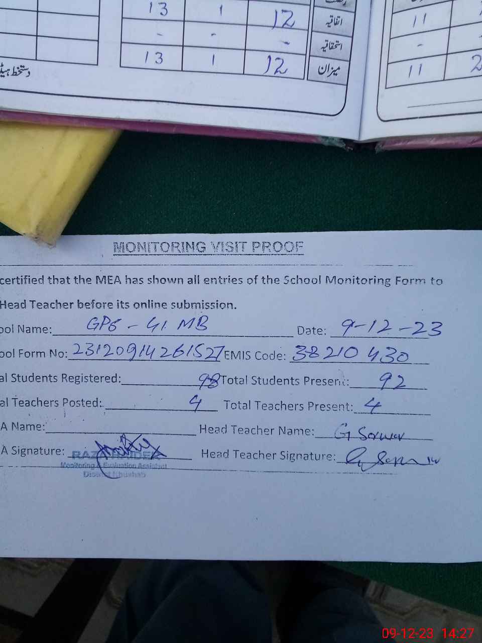 | Attendance Register | Head Teacher | MEA with School | Visit Proof |