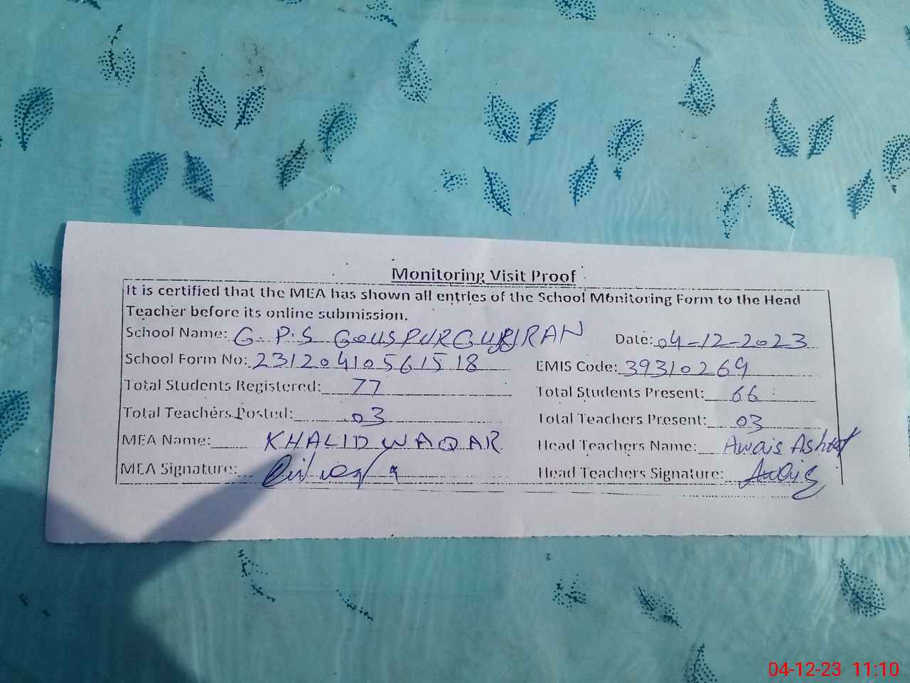| EMIS Code: 39310269 | Name of School: GPS GHOUS PUR GUJJRAN (GHATTAY PHAKNI) | |||
