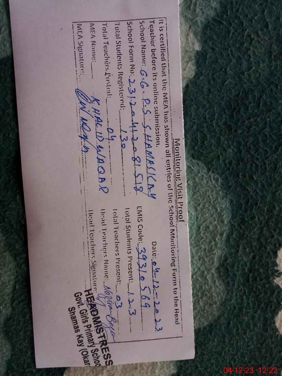 | EMIS Code: 39310569 | Name of School: GGPS SHAMAS KAY | |||