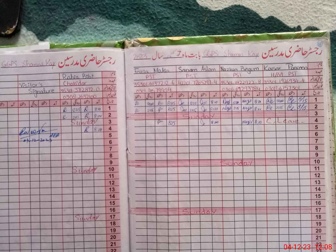 | CNIC | Full Name | Designation | R/C | Absence During Last Calender Month |