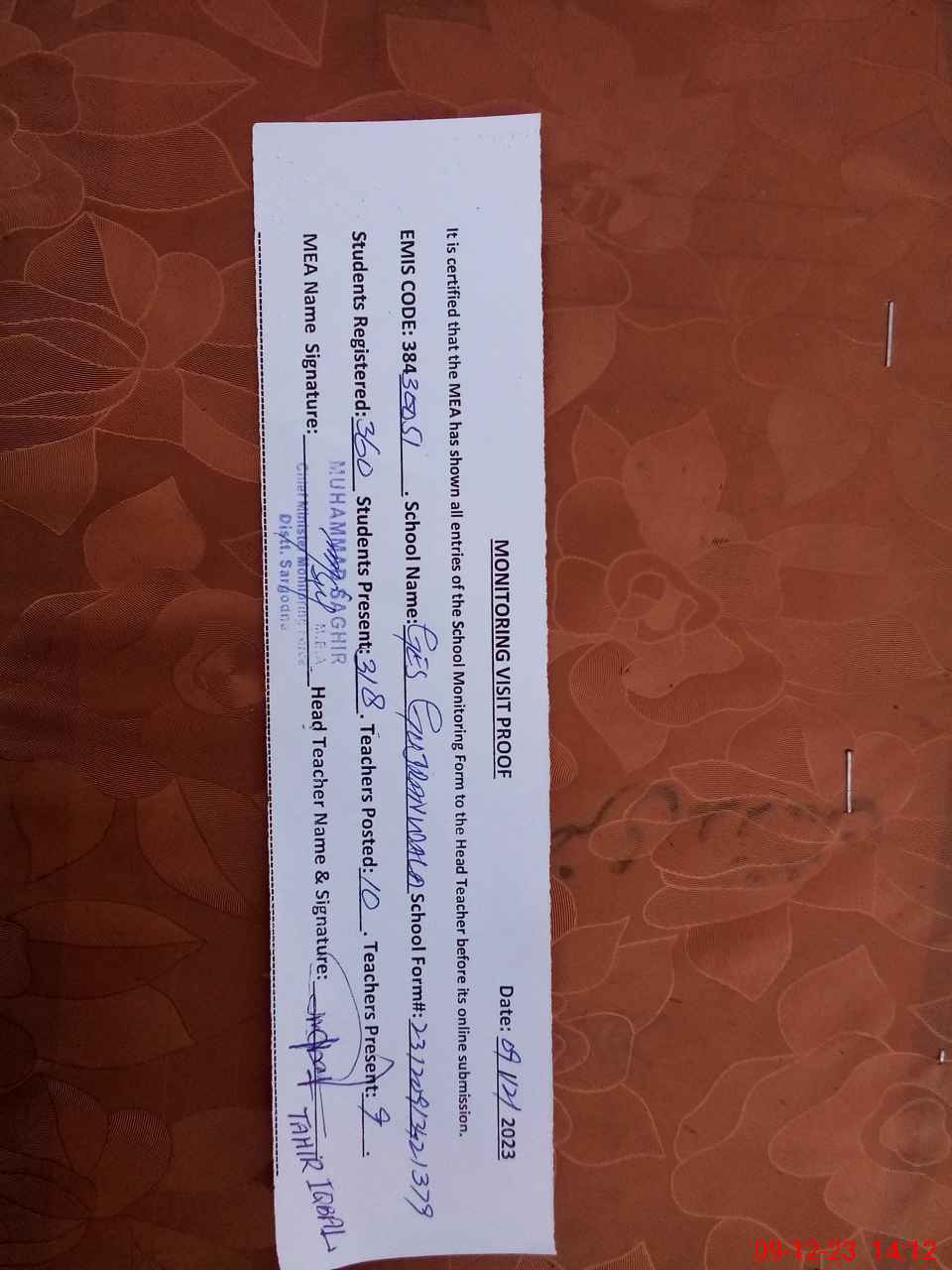 | Attendance Register | Head Teacher | MEA with School | Visit Proof |
