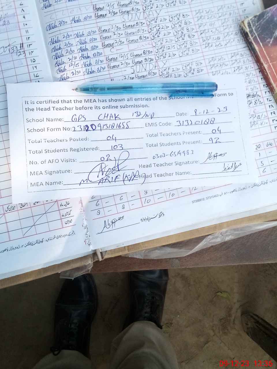 | Attendance Register | Head Teacher | MEA with School | Visit Proof |