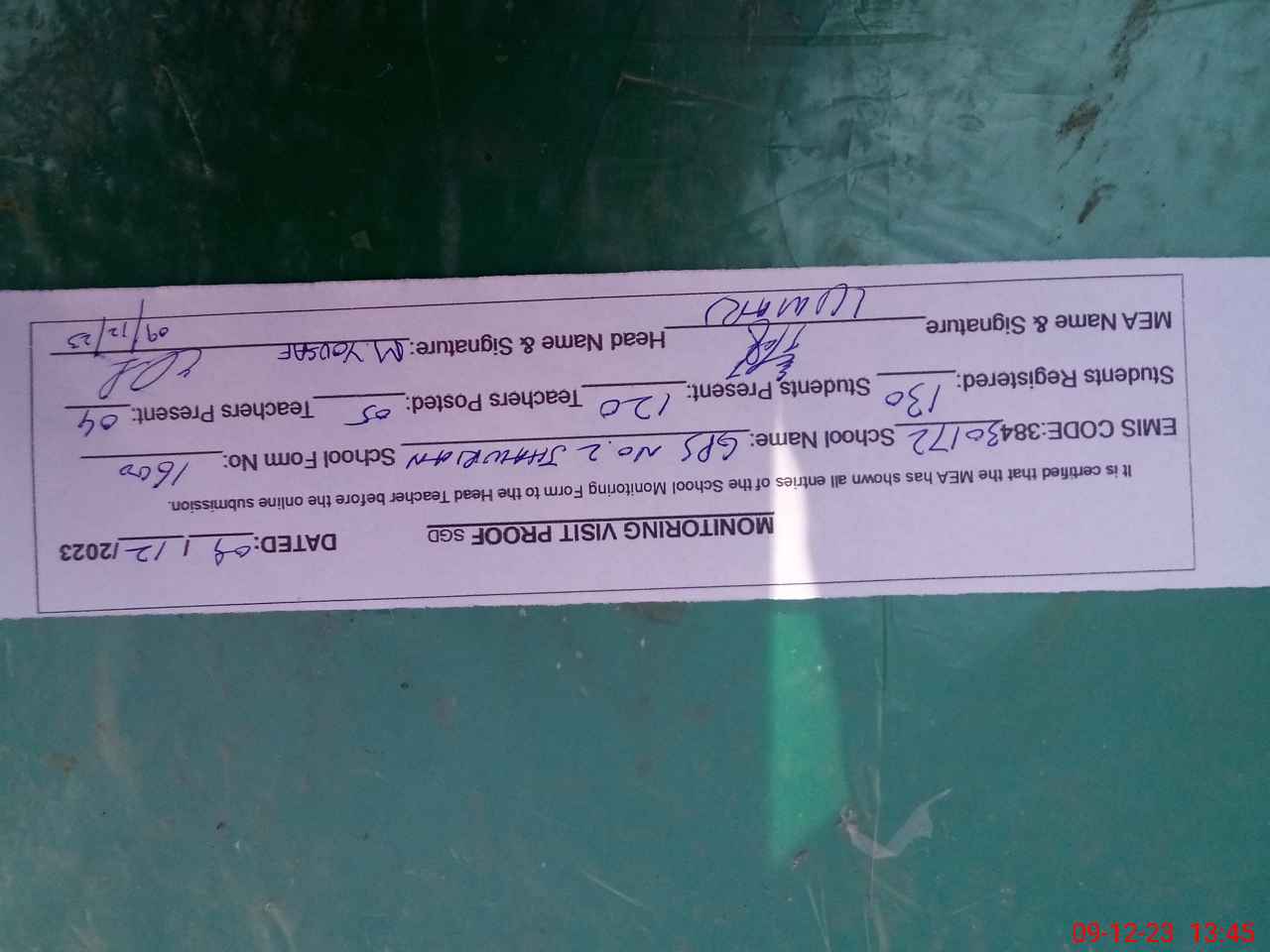 | Attendance Register | Head Teacher | MEA with School | Visit Proof |