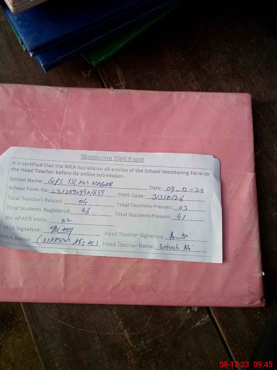 | Attendance Register | Head Teacher | MEA with School | Visit Proof |