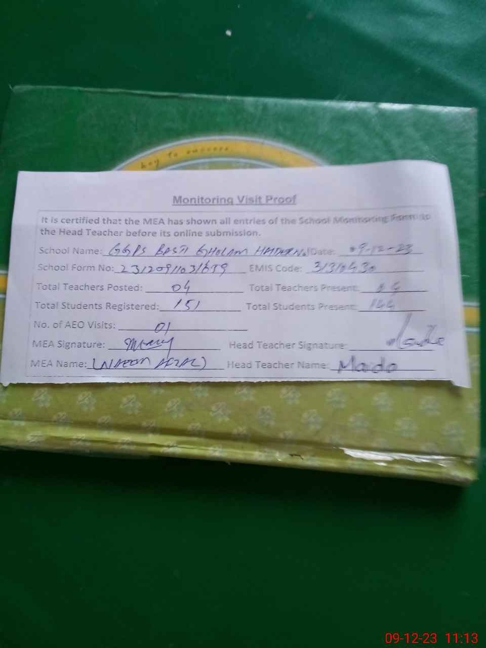 | Attendance Register | Head Teacher | MEA with School | Visit Proof |