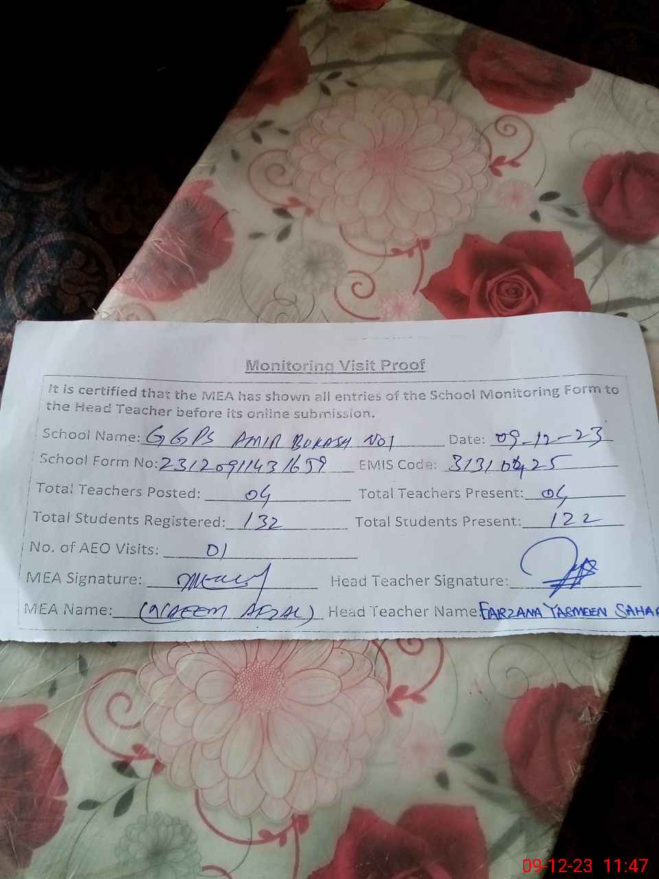 | Attendance Register | Head Teacher | MEA with School | Visit Proof |