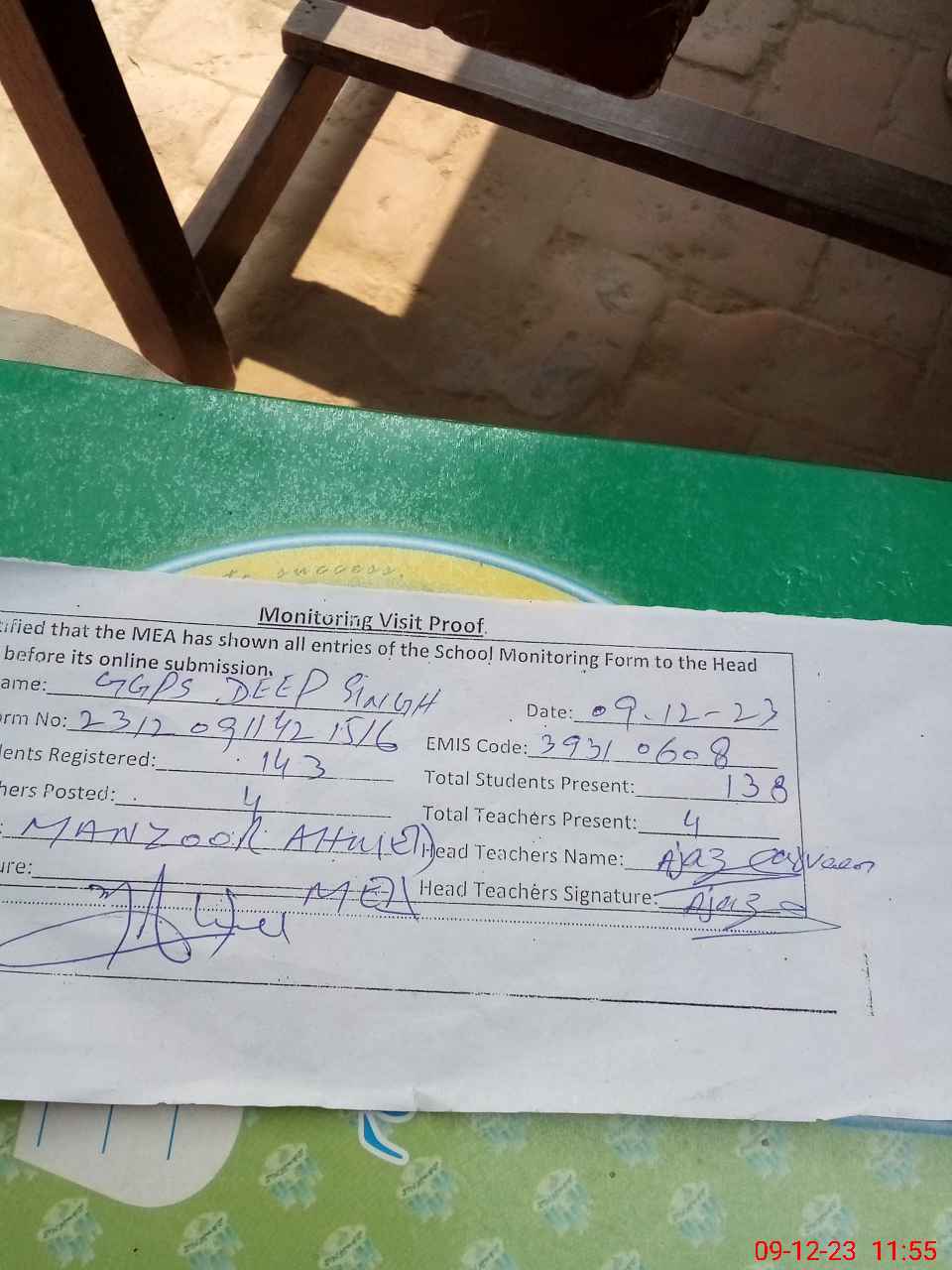 | Attendance Register | Head Teacher | MEA with School | Visit Proof |