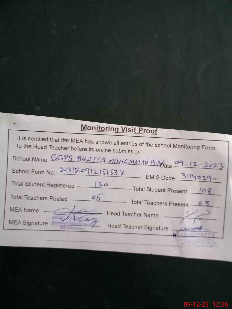 | Attendance Register | Head Teacher | MEA with School | Visit Proof |