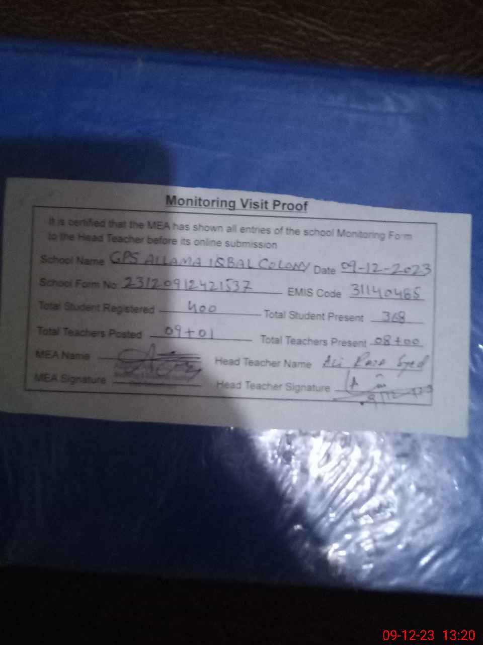 | Attendance Register | Head Teacher | MEA with School | Visit Proof |