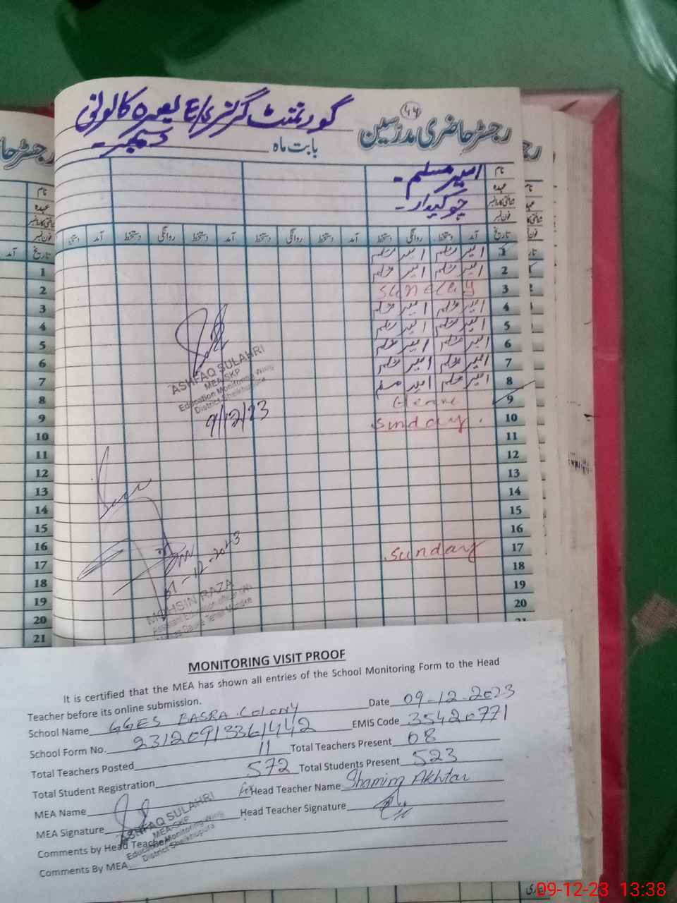 | Attendance Register | Head Teacher | MEA with School | Visit Proof |