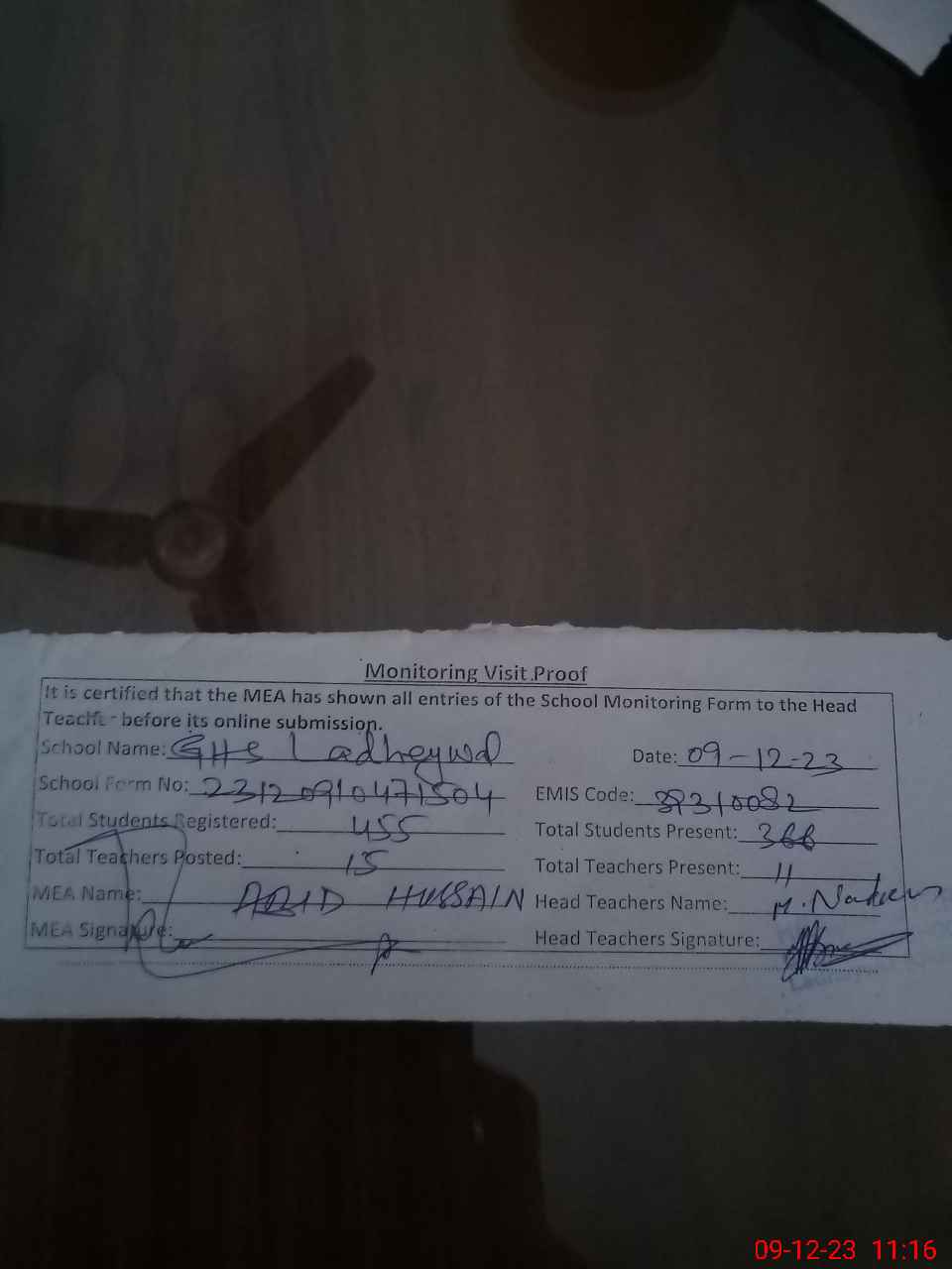 | EMIS Code: 39310082 | Name of School: GHS LADHEY WAL | |||