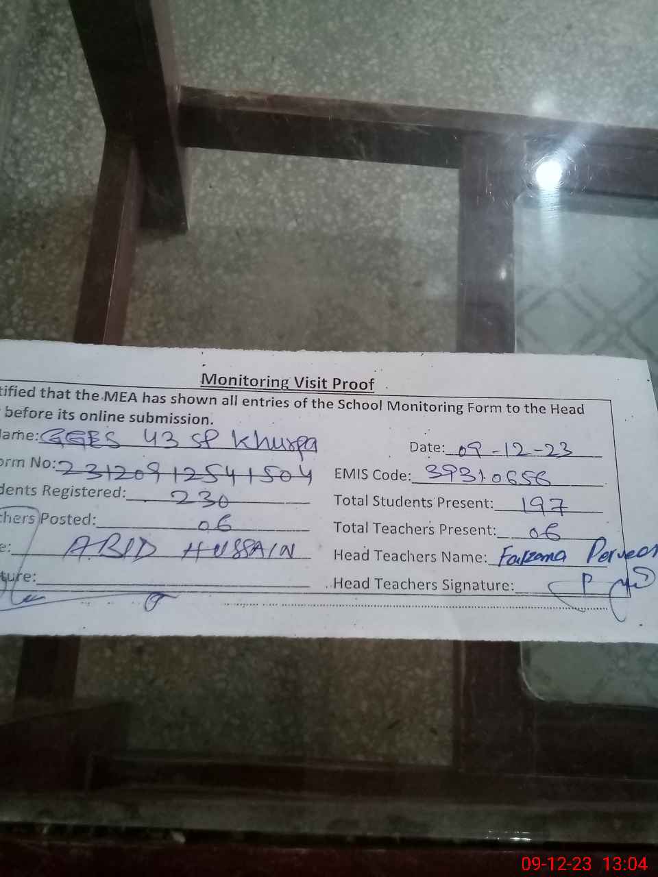 | Attendance Register | Head Teacher | MEA with School | Visit Proof |