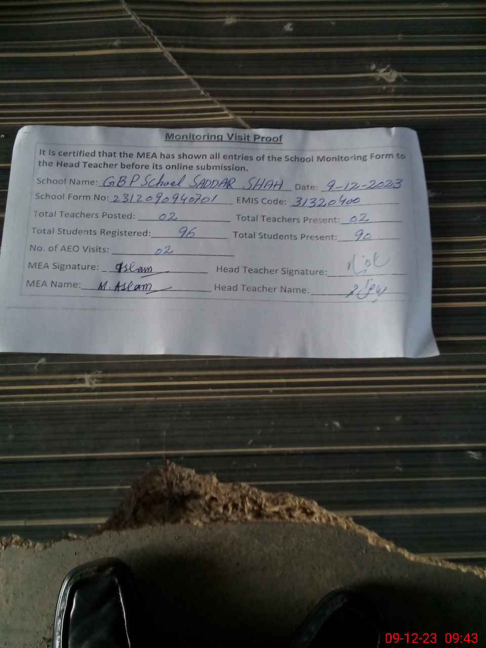 | Attendance Register | Head Teacher | MEA with School | Visit Proof |
