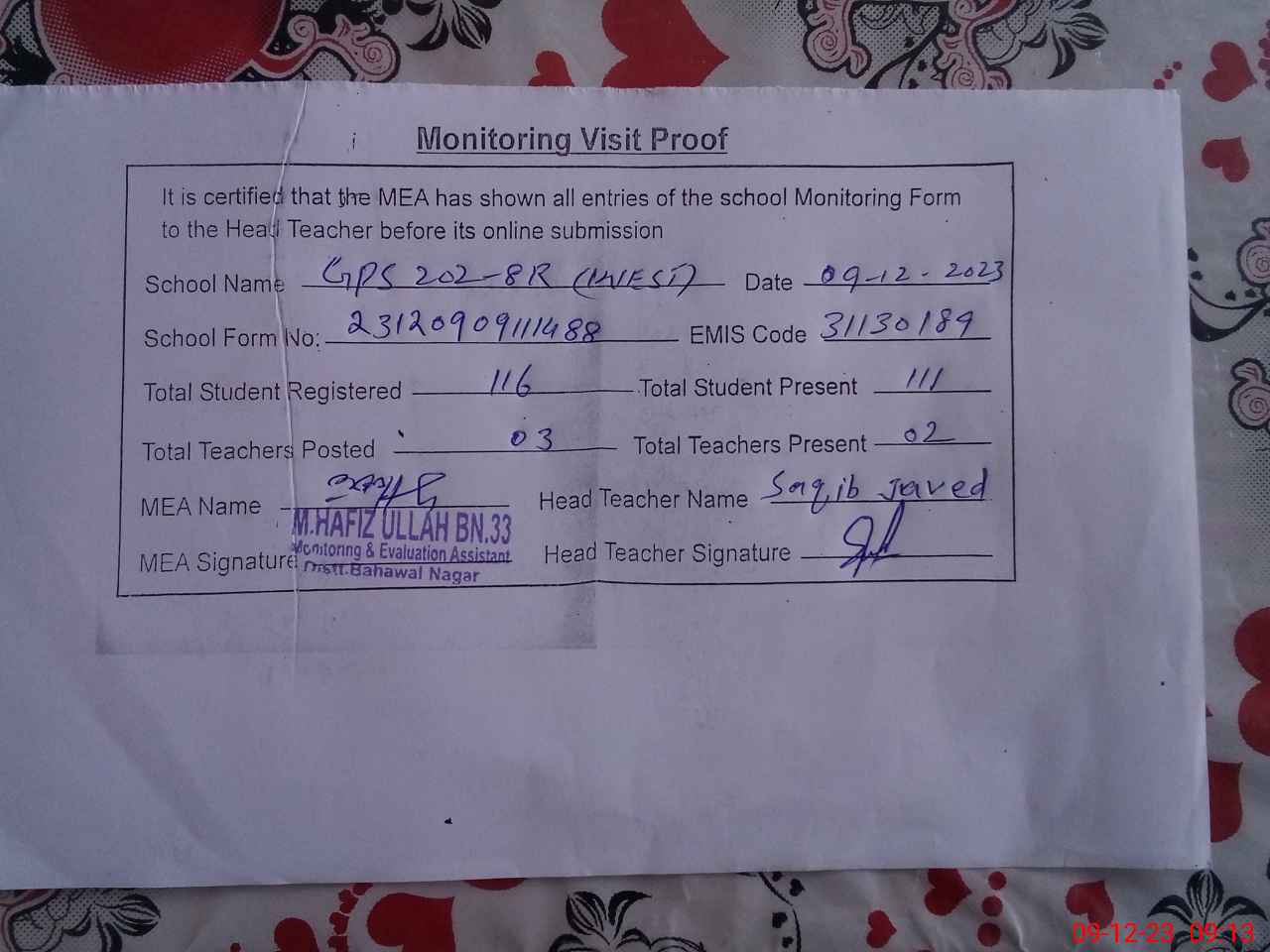 | EMIS Code: 31130189 | Name of School: GPS CHAK 202/8-R WEST | |||