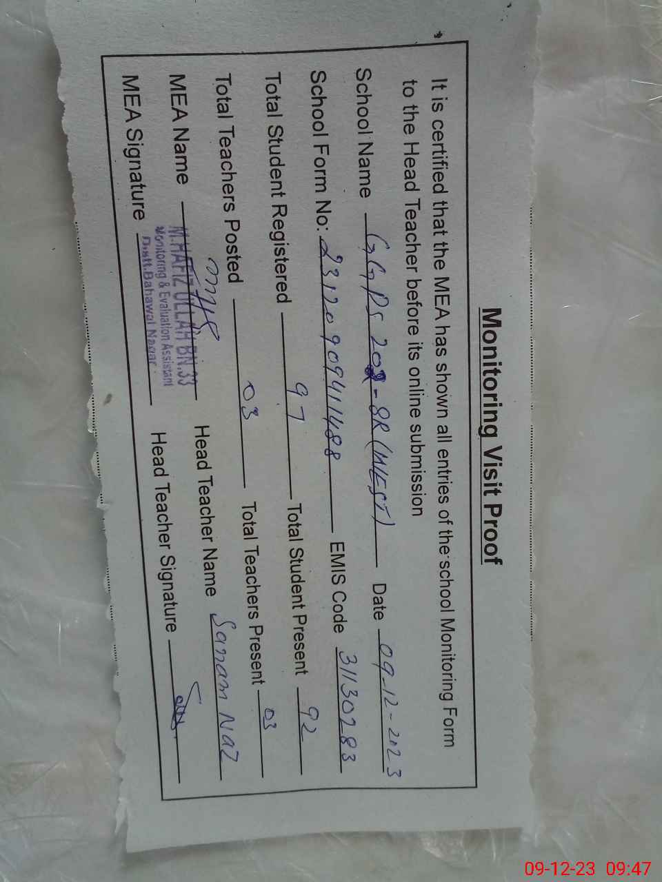 | Attendance Register | Head Teacher | MEA with School | Visit Proof |