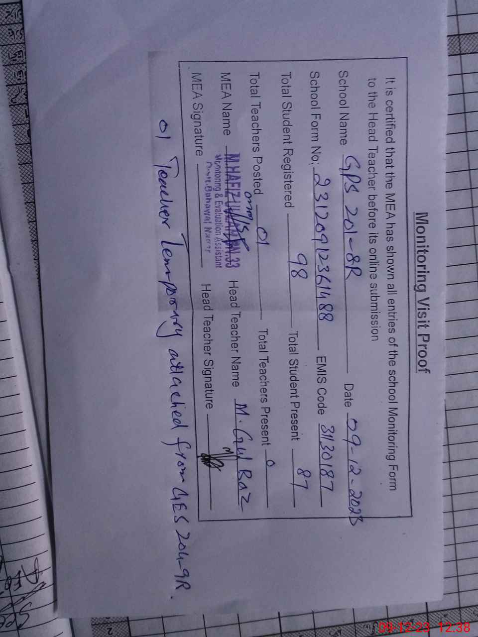 | Attendance Register | Head Teacher | MEA with School | Visit Proof |