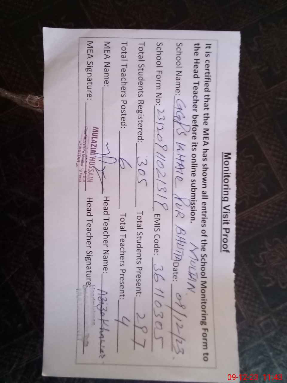| EMIS Code: 36110305 | Name of School: GGPS KHAIR PUR BHUTTA QASIM BELA | |||