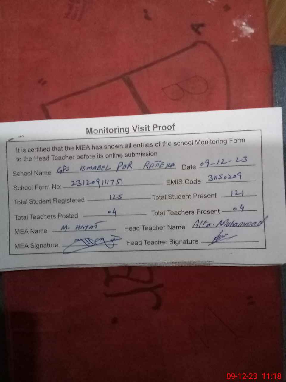 | Attendance Register | Head Teacher | MEA with School | Visit Proof |