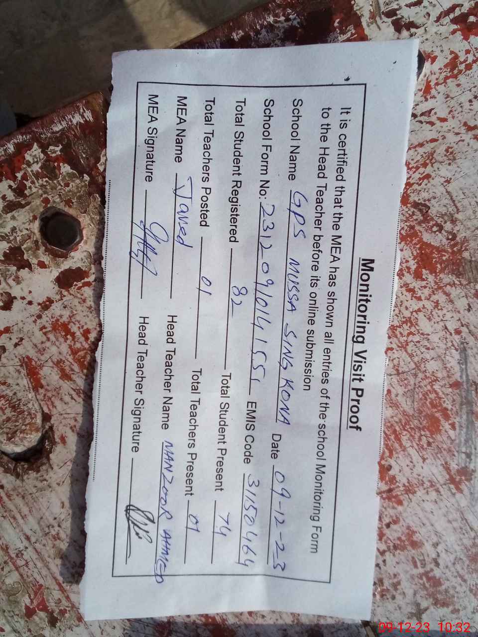 | Attendance Register | Head Teacher | MEA with School | Visit Proof |