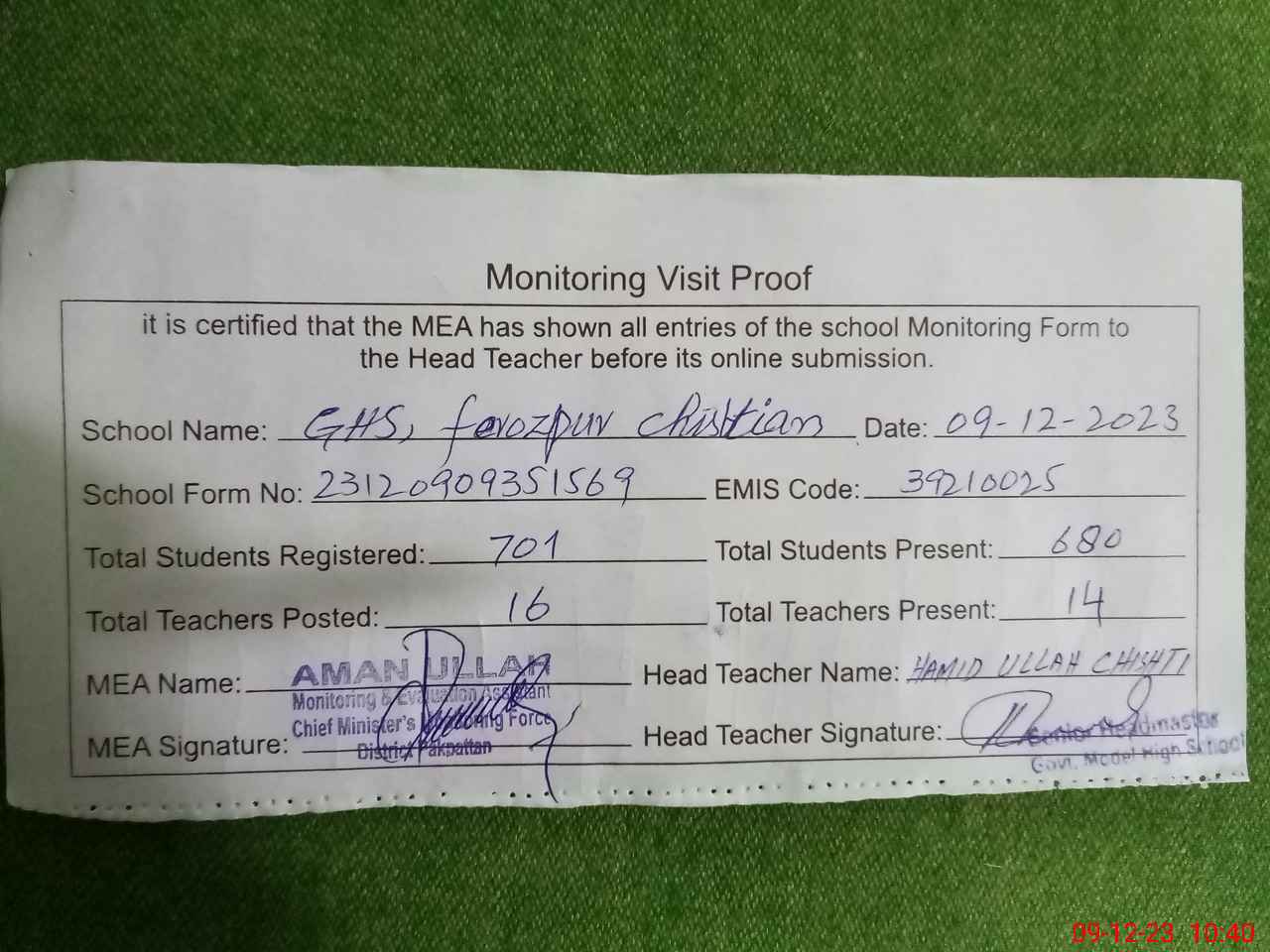 | Attendance Register | Head Teacher | MEA with School | Visit Proof |