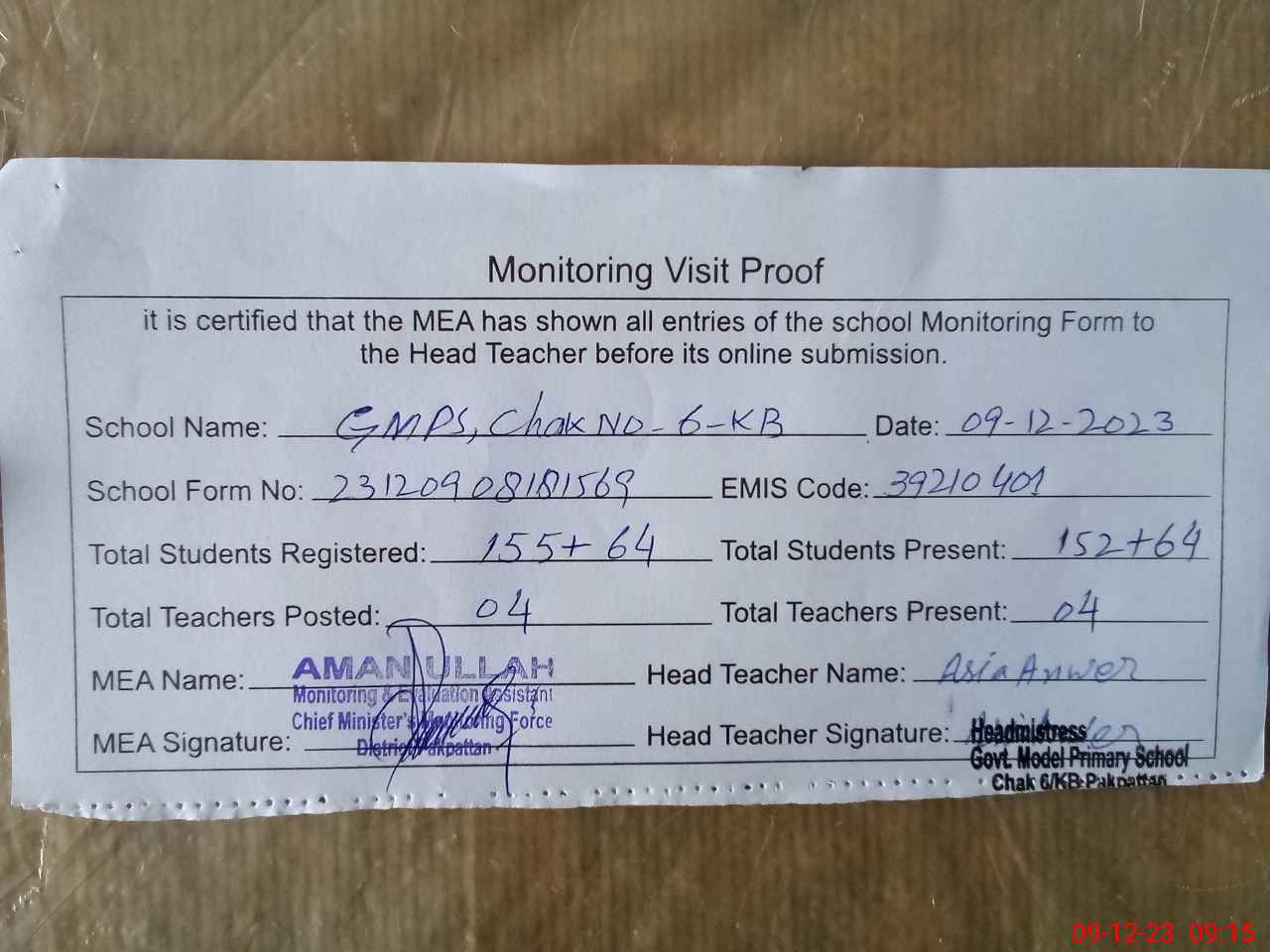 | Attendance Register | Head Teacher | MEA with School | Visit Proof |