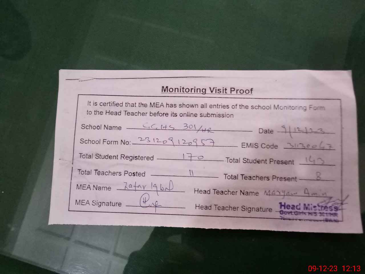 | Attendance Register | Head Teacher | MEA with School | Visit Proof |