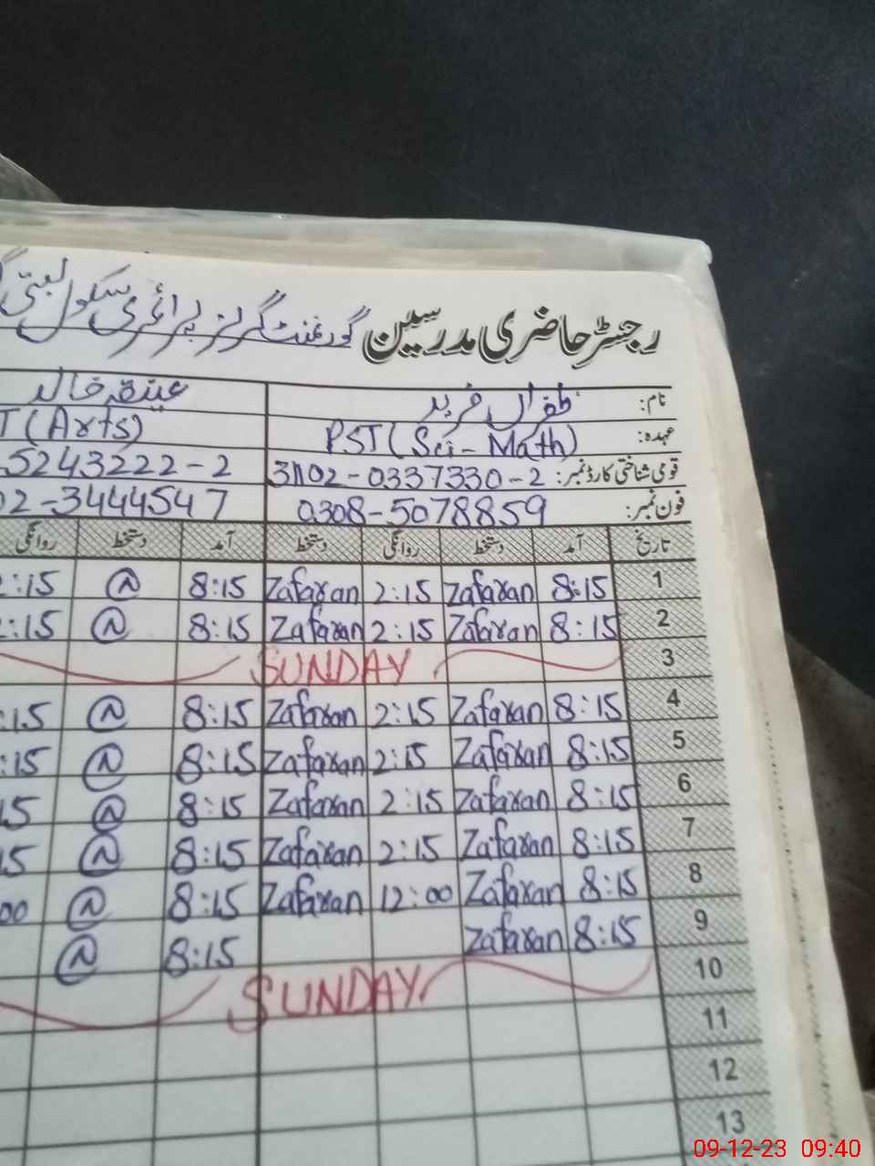 | Name: ZA**** FR**** Designation: (School Headmaster's/Headmistress's) ESE SCI MATH Phone/Cell Number: 03**** |