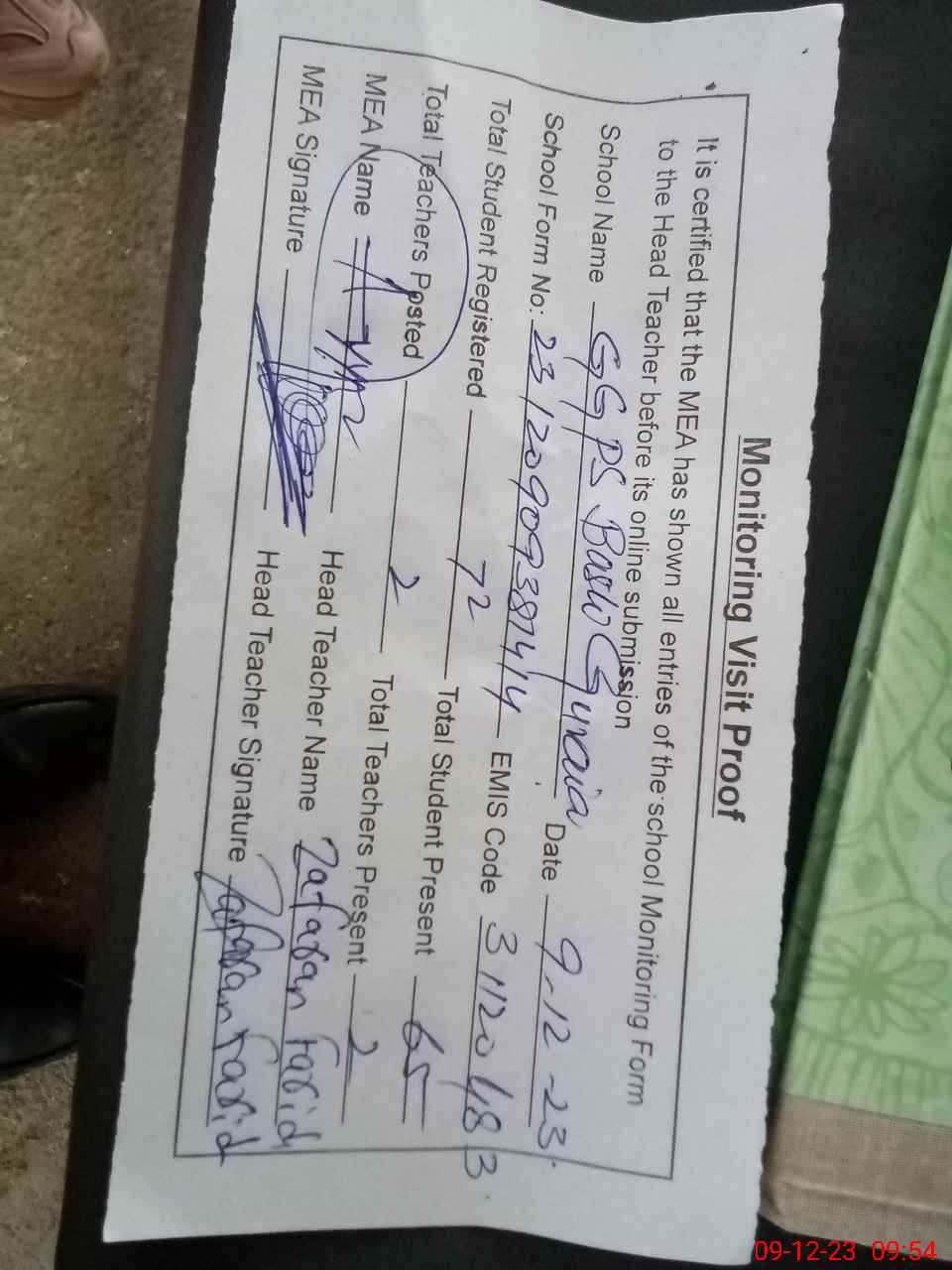 | Attendance Register | Head Teacher | MEA with School | Visit Proof |