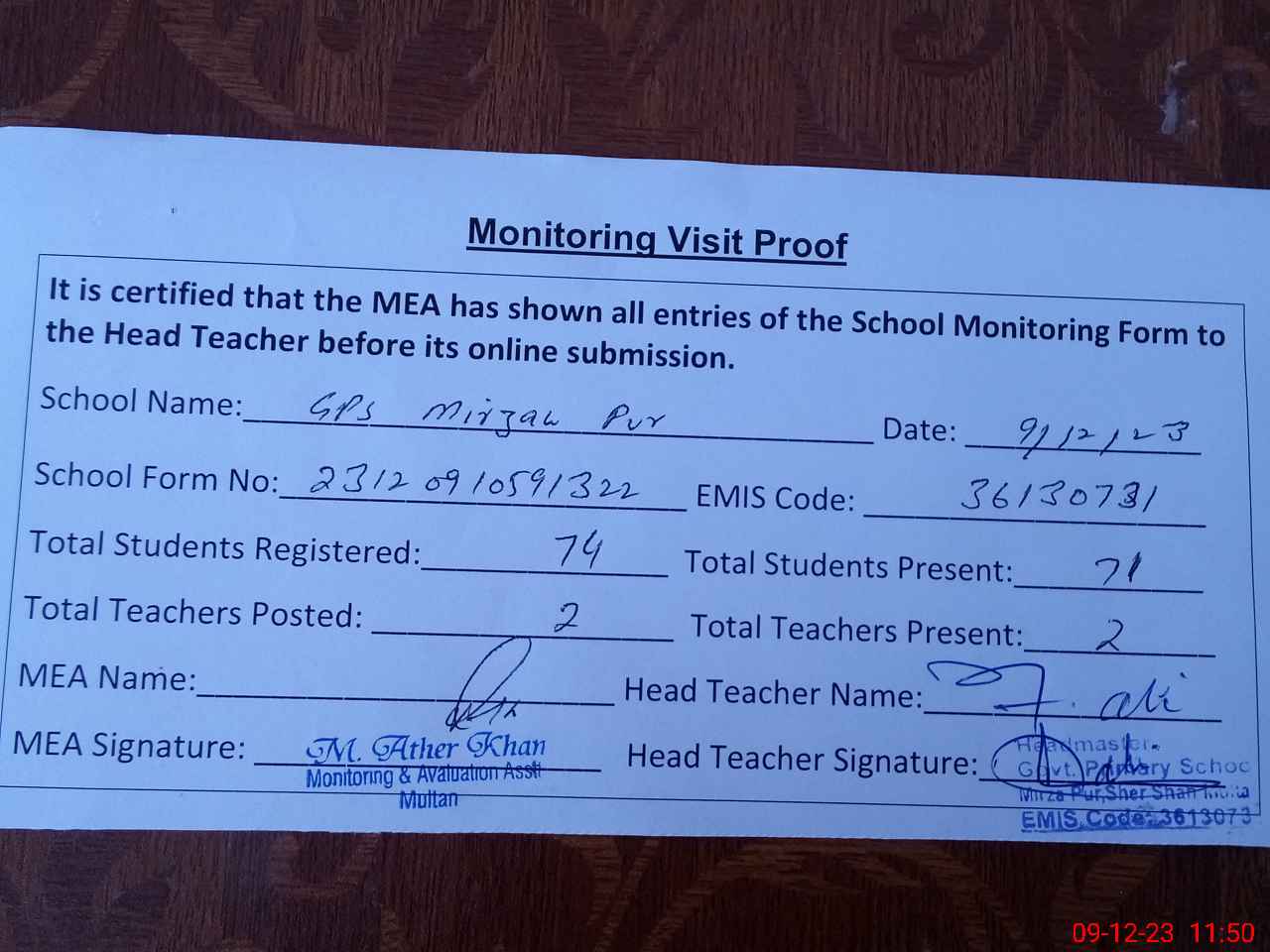 | Attendance Register | Head Teacher | MEA with School | Visit Proof |