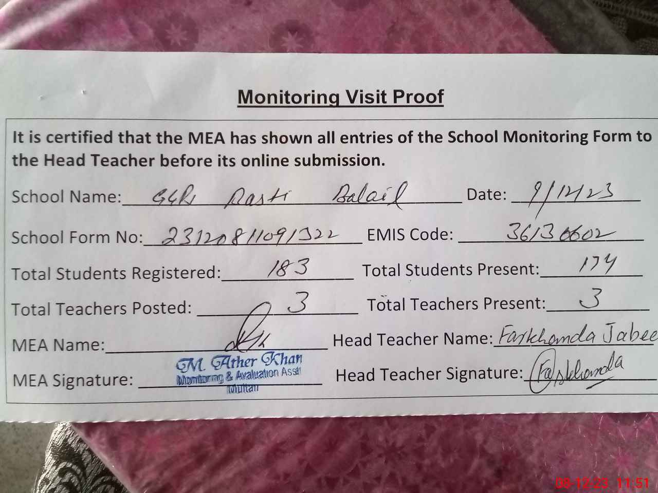 | Attendance Register | Head Teacher | MEA with School | Visit Proof |