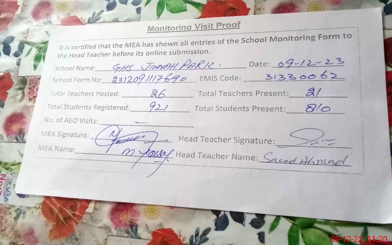 | EMIS Code: 31330062 | Name of School: GHS JINNAH PARK | |||