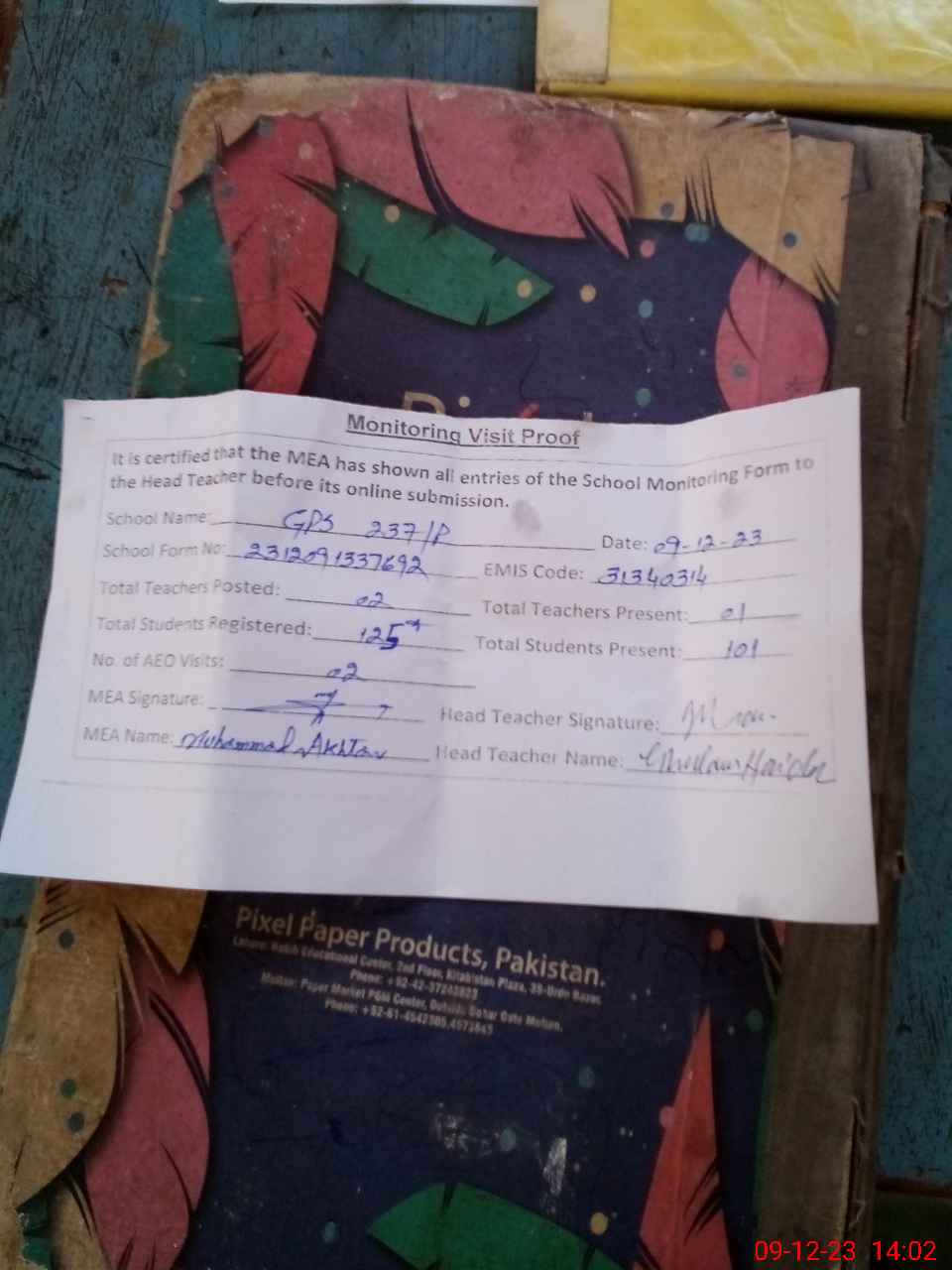 | Attendance Register | Head Teacher | MEA with School | Visit Proof |