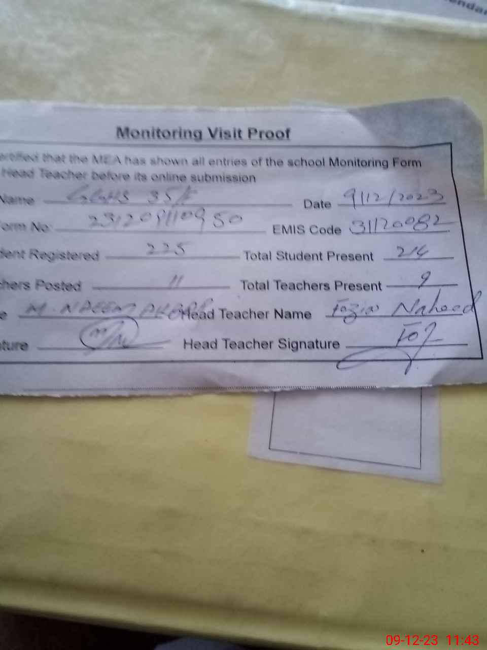 | Attendance Register | Head Teacher | MEA with School | Visit Proof |