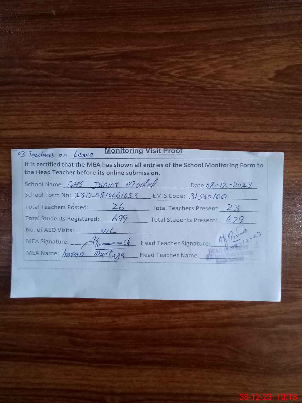 | Attendance Register | Head Teacher | MEA with School | Visit Proof |
