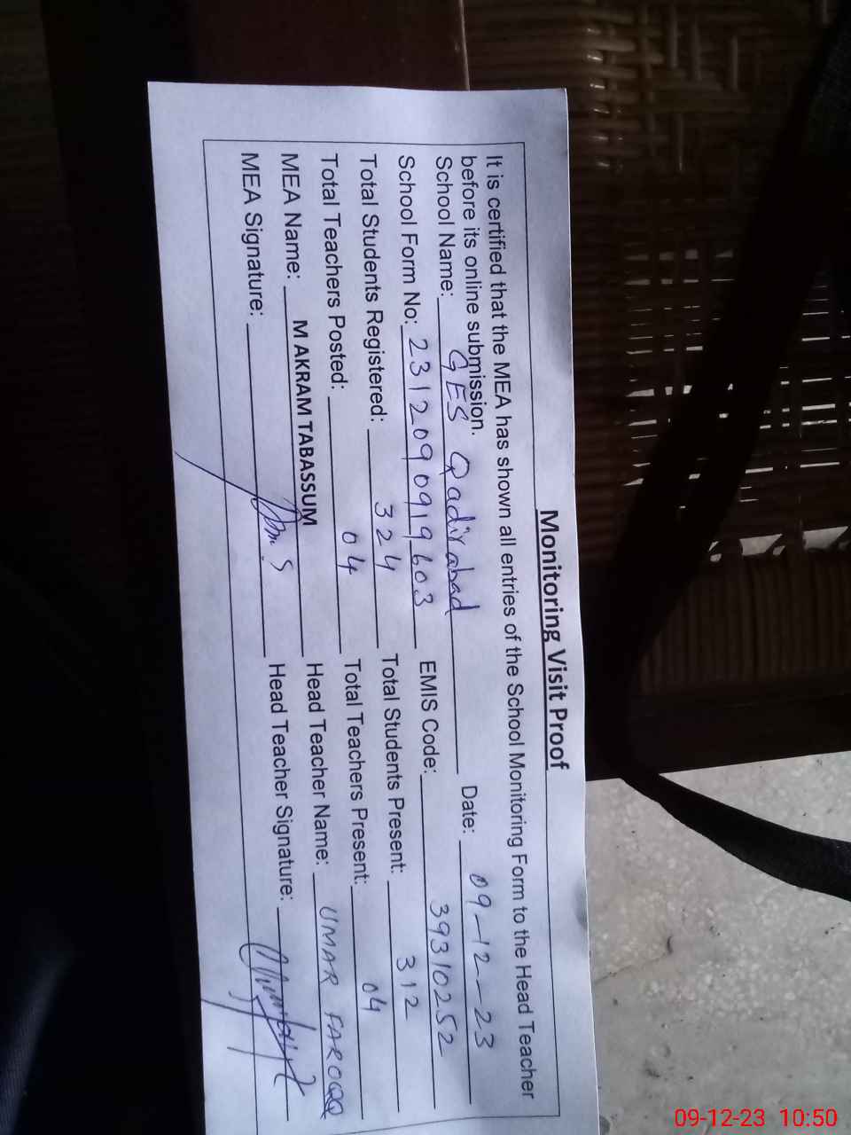 | Attendance Register | Head Teacher | MEA with School | Visit Proof |