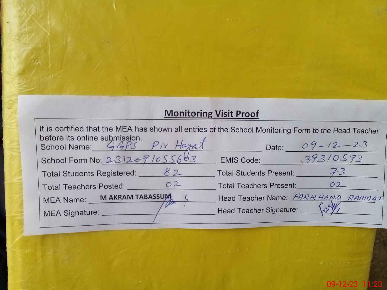 | Attendance Register | Head Teacher | MEA with School | Visit Proof |