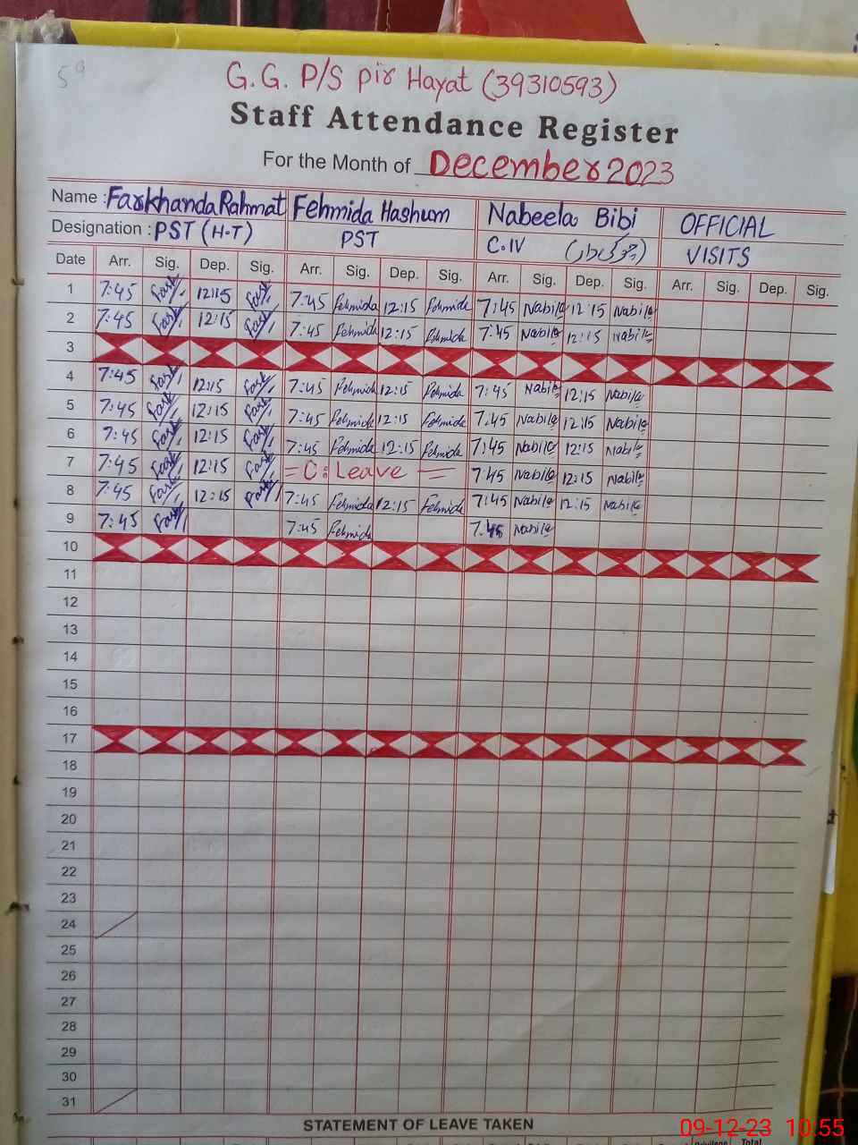 | CNIC | Full Name | Designation | R/C | Absence During Last Calender Month |