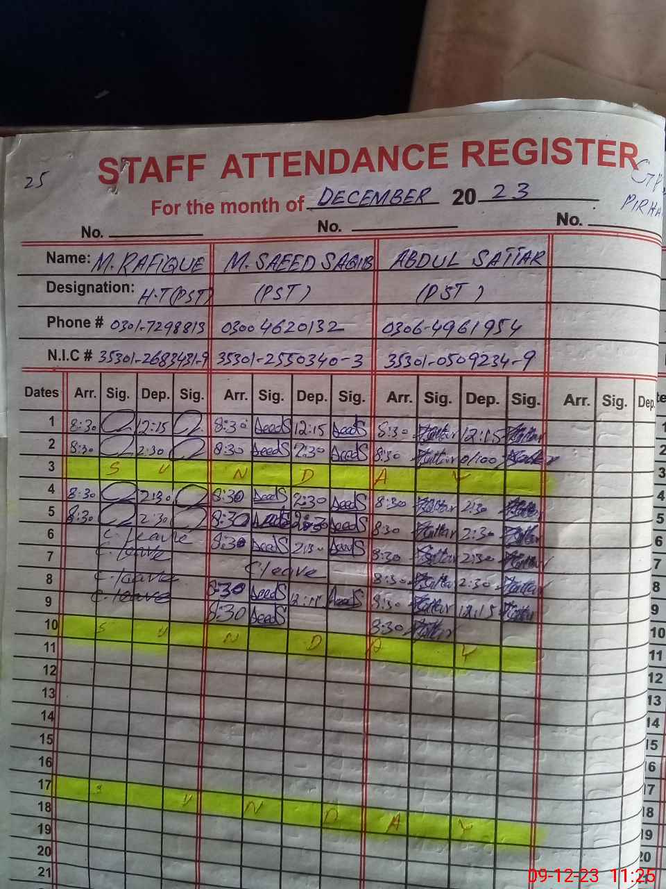 | CNIC | Full Name | Designation | R/C | Absence during last cal. month |