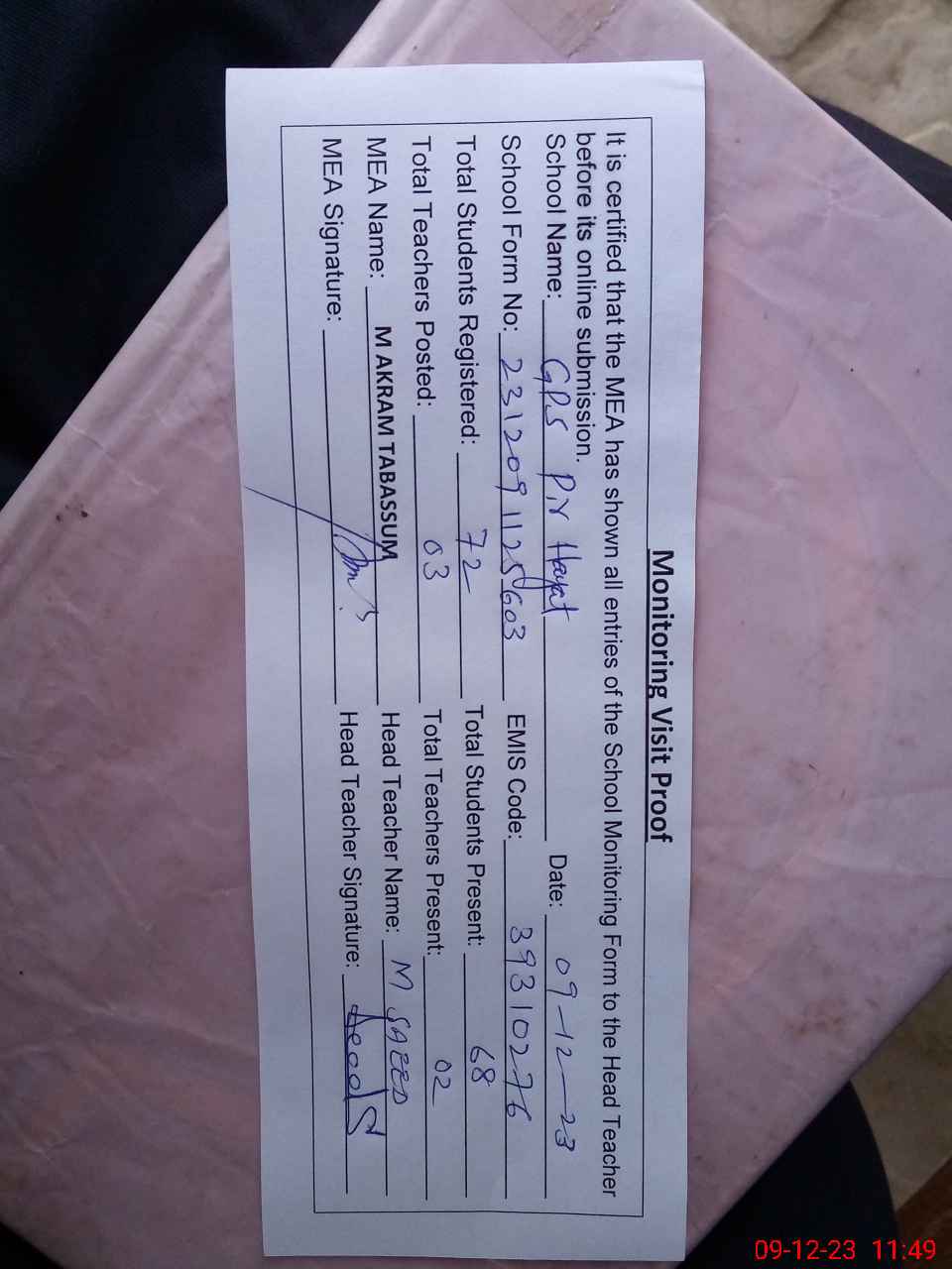 | Attendance Register | Head Teacher | MEA with School | Visit Proof |