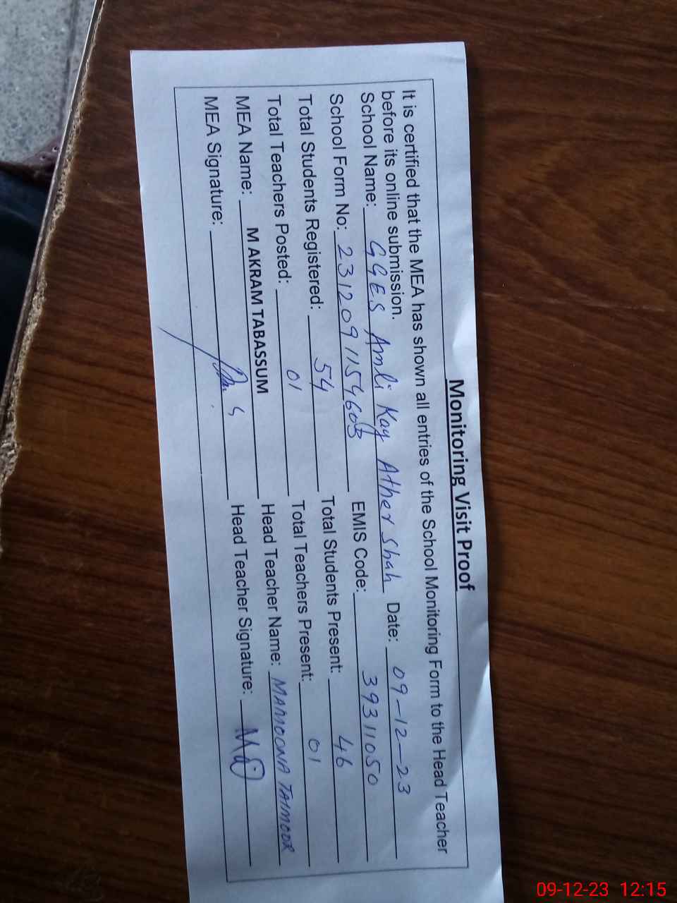 | Attendance Register | Head Teacher | MEA with School | Visit Proof |