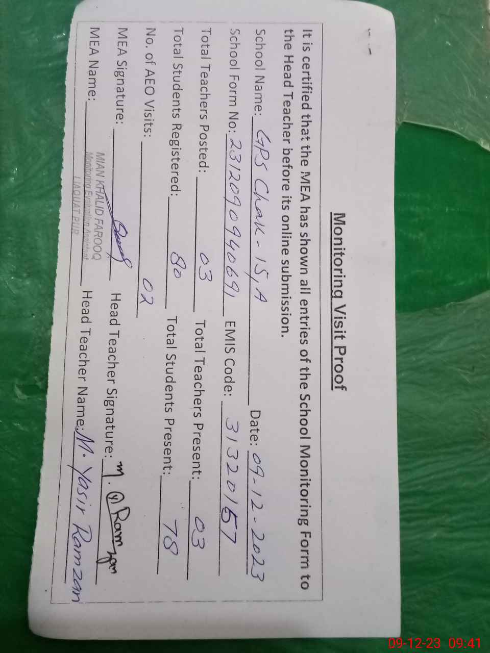 | Attendance Register | Head Teacher | MEA with School | Visit Proof |