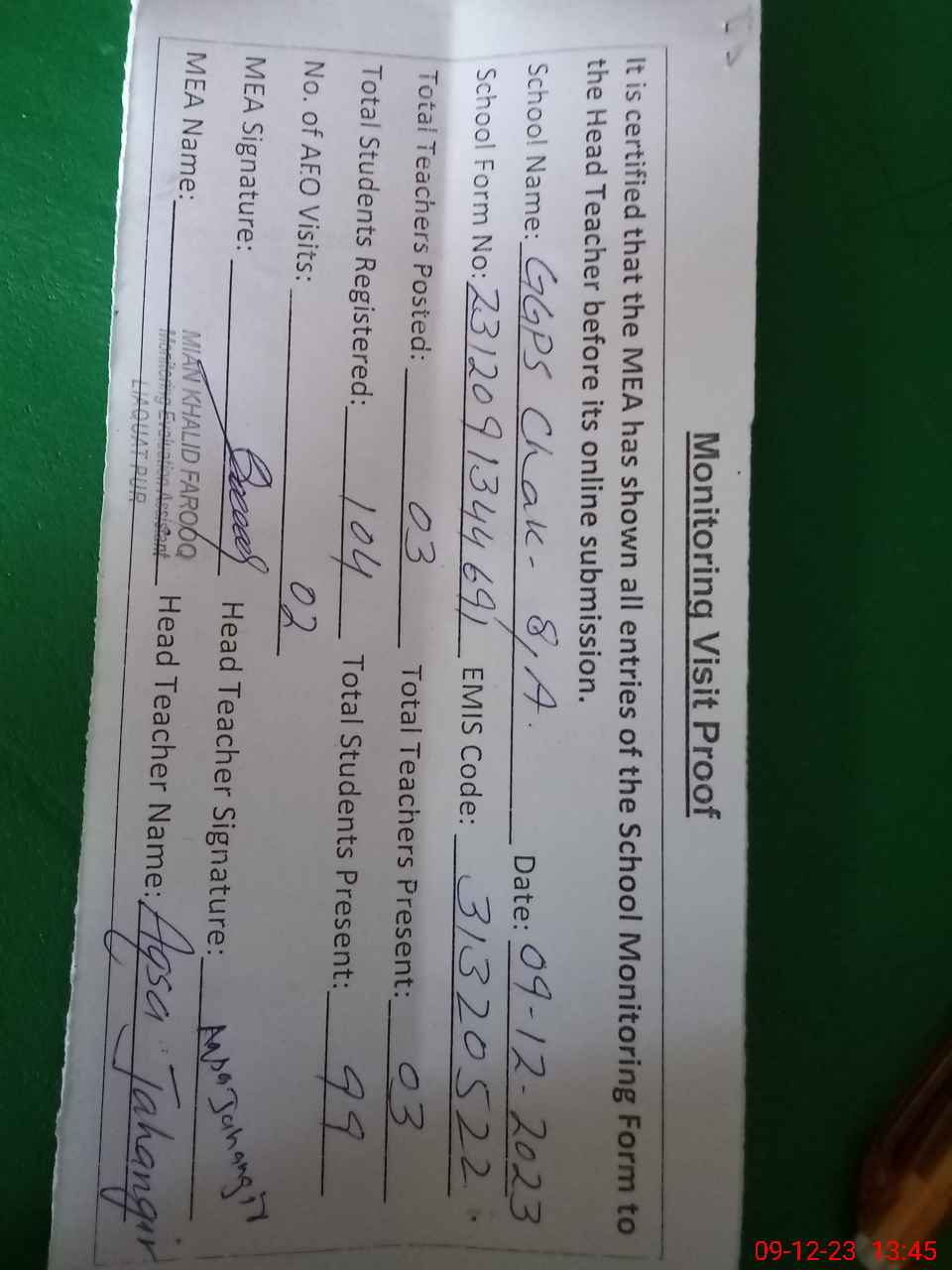 | Attendance Register | Head Teacher | MEA with School | Visit Proof |