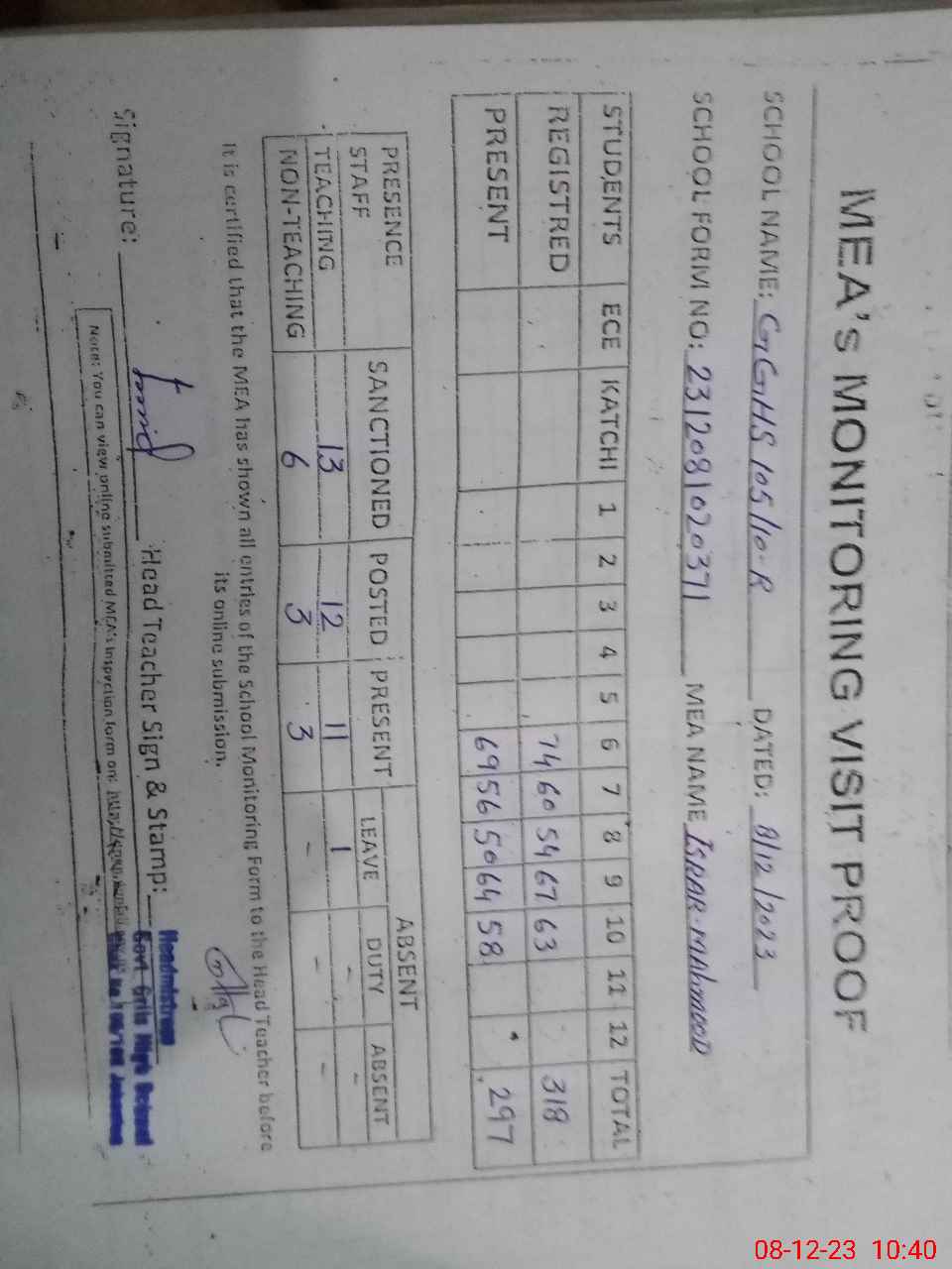| Attendance Register | Head Teacher | MEA with School | Visit Proof |