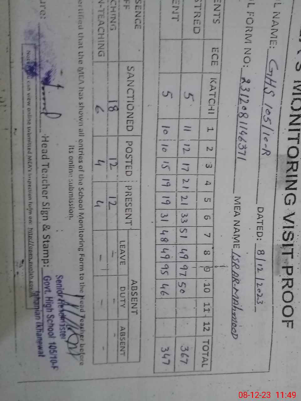 | Attendance Register | Head Teacher | MEA with School | Visit Proof |