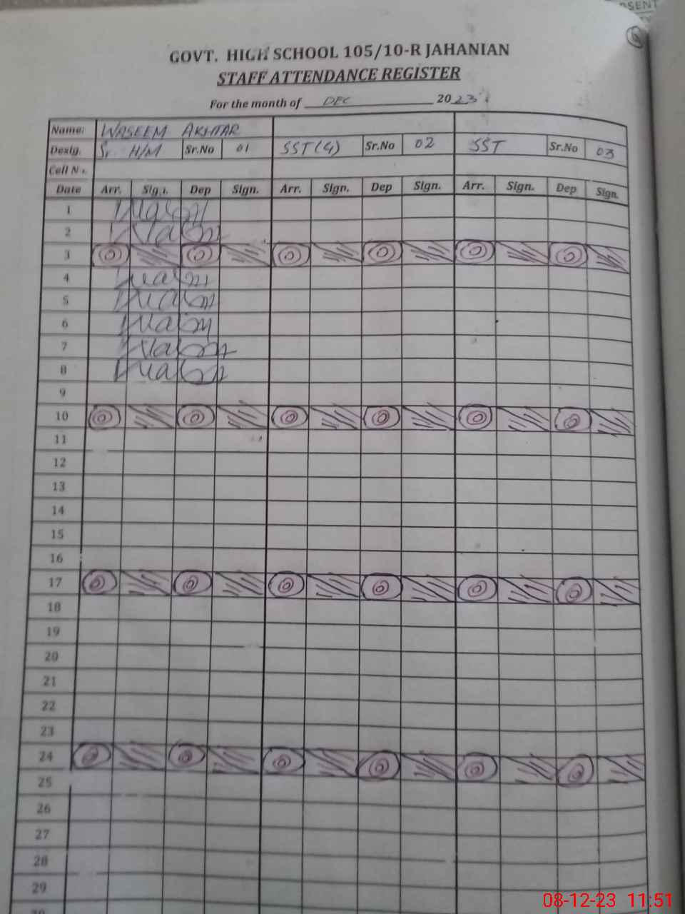 | CNIC | Full Name | Designation | R/C | Absence During Last Calender Month |
