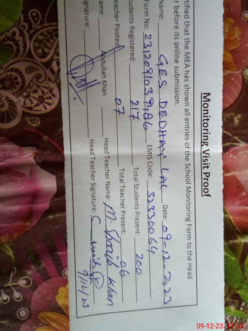 | Attendance Register | Head Teacher | MEA with School | Visit Proof |