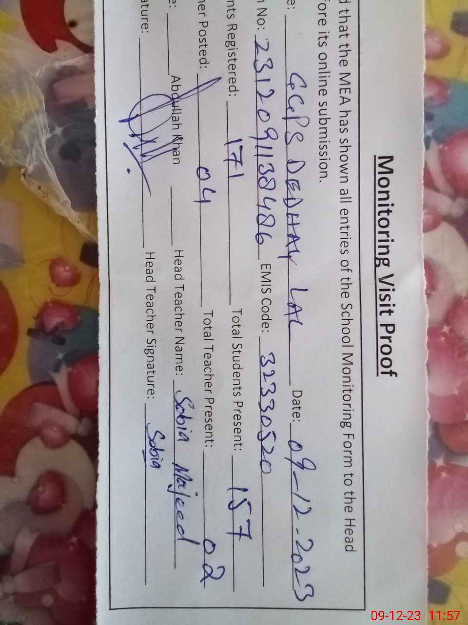 | Attendance Register | Head Teacher | MEA with School | Visit Proof |