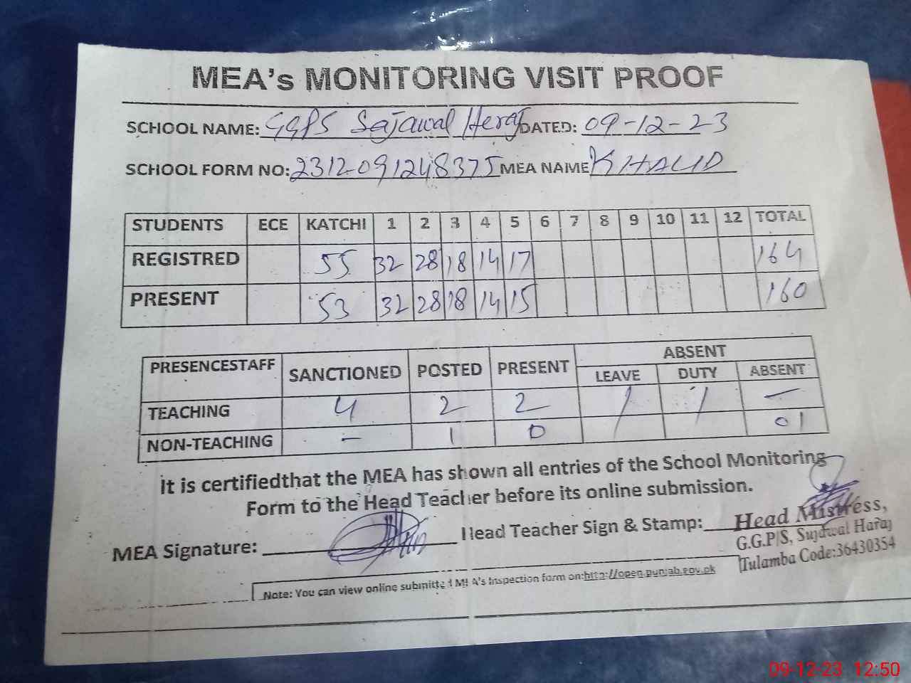 | Attendance Register | Head Teacher | MEA with School | Visit Proof |