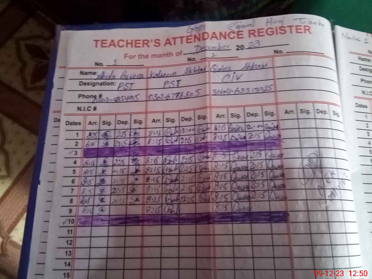 | CNIC | Full Name | Designation | R/C | Absence During Last Calender Month |